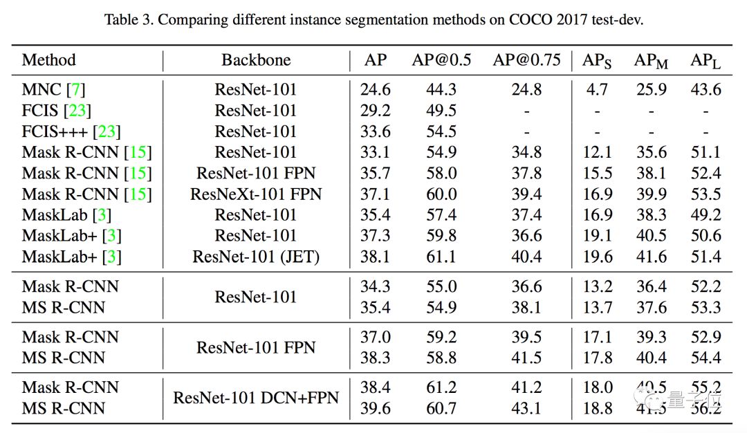 下面的表格,是COCO 2017测试集(Test-Dev set)上MS R-CNN和其他实例分割方法的成绩对比。