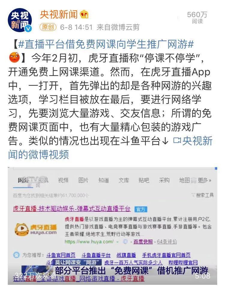 央视新闻点名虎牙和斗鱼:借免费网课向学生推广网游。虎牙回应:广告已下线