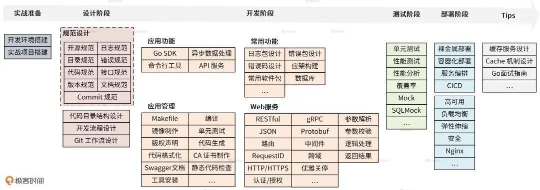 具体怎么做呢?先看一张图谱,涵盖了 Go 项目开发中大部分技能点,内容是按开发顺序排列的,如果这些技能点你都能掌握,上面的那些就不成问题了: