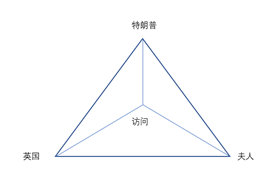将第一步提取出的事件触发词、事件元素(名实体、时间、地点以及有意义的补语状语等)作为节点,连接成一个具有中心节点的封闭多边形。比如句子“特朗普携夫人访问英国。”中提取出事件元素“特朗普”、“夫人”、“英国”,提取出事件触发词“访问”,首先将“访问”与“特朗普”、“夫人”、“英国”分别相连,再将“特朗普”、“夫人”、“英国”按照在句子中出现的先后顺序依次连接起来。构成图形如下: