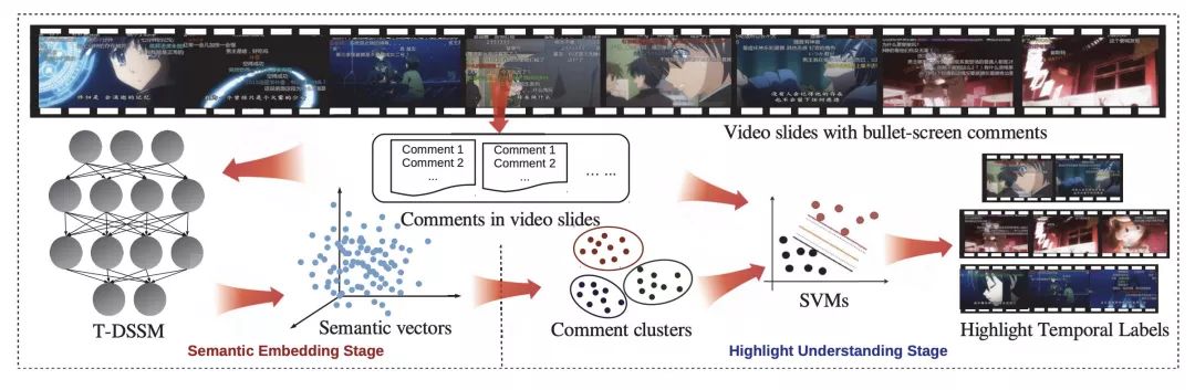 最后,语义表示技术的发展使得多媒体信息的有效建模与语义表示成为可能,进而为推荐、检索等实际应用场景提供支撑。近年来,多媒体共享平台取得了突飞猛进的发展。其中一种叫做“弹幕”的视频实时评论愈发流行。为了有效理解视频片段的内容,如图3 所示,基于深度神经网络的弹幕语义表征方法[20] 通过利用弹幕与视频情节之间的关联性,对弹幕进行表示学习,实现了对视频片段的标注。这种方法突破了常规视频推荐/ 检索系统只关注整段视频的局限性,可以满足细粒度的要求。