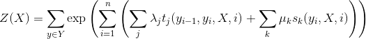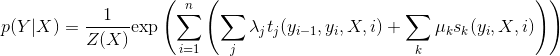 上面的式子中 tj 是定义在边上的特征函数,依赖于当前和前一个位置,称为转移特征,表示对于观察序列 X 及其标注序列在 i 及 i−1 位置上标记的转移概率。sk 是定义在结点上的特征函数,称为状态特征,依赖于当前位置,表示对于观察序列 X 及其 i 位置的标记概率。λj 和 μk 分别是转移特征函数和状态特征函数对应的权值。
