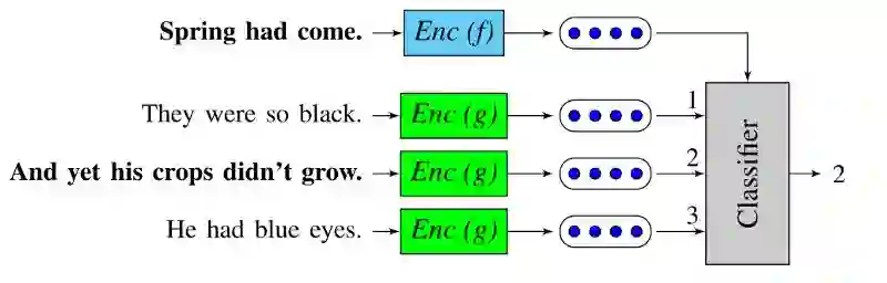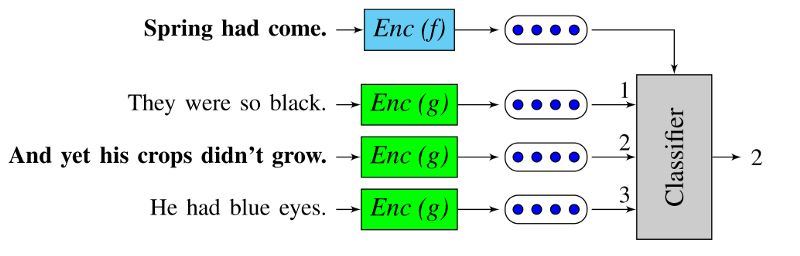 「Quick-thoughts」分类任务示意图。分类器需要从一组句子嵌入中选出下一个句子。图片来自 Logeswaran 等人所著的「An efficient framework for learning sentence representations」。
