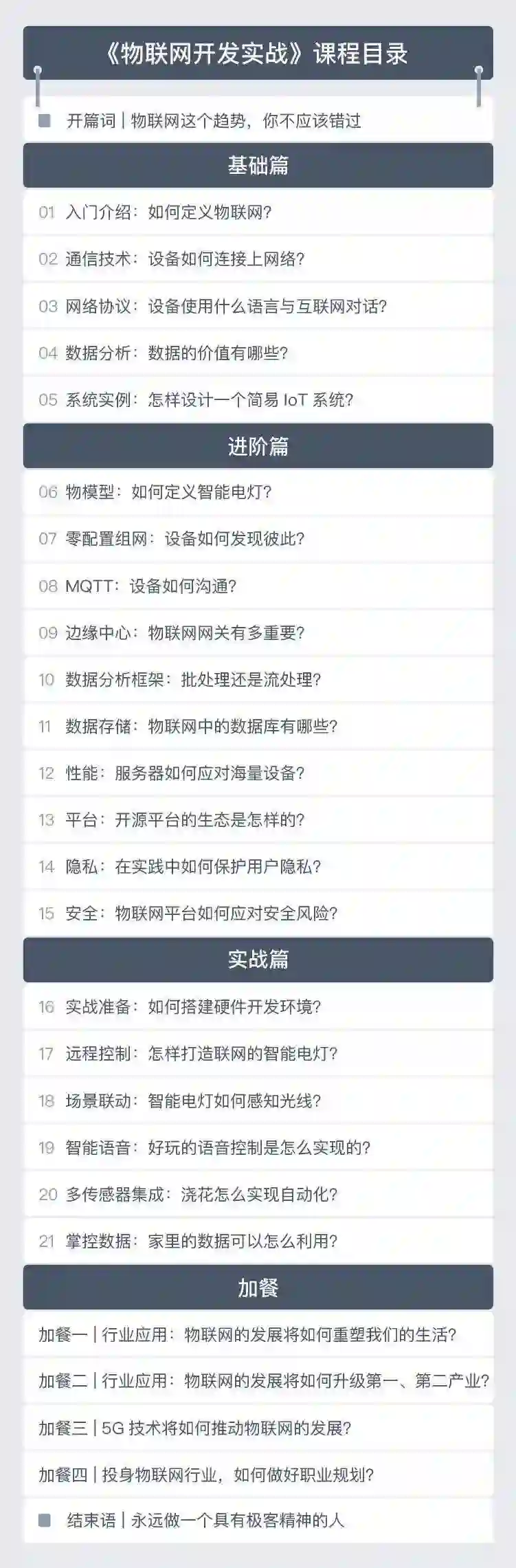 一句话概括的话,就是郭朝斌结合了自己在小米生态的工作经验,梳理出物联网领域庞杂的专业知识、剖析物联网关键技术,带大家从 0 基础开始设计一个智能家居系统。