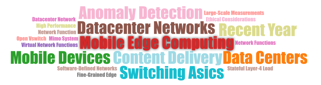 根据 AMiner 对近 5 年收录论文主题分析,处于热点的主题有移动边缘计算,数据中心网络,异常检测,移动设备,内容传递,交换 Asics 等。具体热词见词云图。