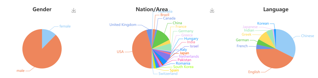 根据 AMiner 统计结果,可以看出论文作者以男性为主,约占据了 87%,来自美国的作者最多,占据了 45%,其次是中国,占据了 12%,来自中美的学者依旧超过了全部人数的一半。紧随其后的投稿活跃的国家是德国(6%),以色列(5%),意大利(4%)。