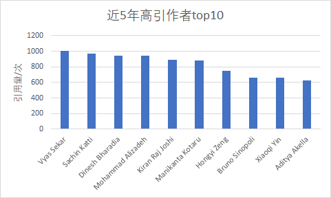 从排名靠前高引作者来看,与机构按投稿数量与引用数量排名变化不大相比,大部分投稿靠前的作者并没有出现在引用量靠前的作者榜单,投稿前十的作者中只有两位同时也是引用量前十的作者,他们分别是来自麻省理工学院的 Mohammad Alizadeh,威斯康星州互联网与系统研究实验室的 Aditya Akella。引用量靠前的作者们引用量差距不大,平均有 800 左右的引用,排名第一的是来自卡耐基梅隆大学的 Vyas Sekar,总计有 1006 次引用。值得注意的是,两名华人作者 Hongy Zeng,Xiaoqi Yin 分别以 748、664 次引用榜上有名!