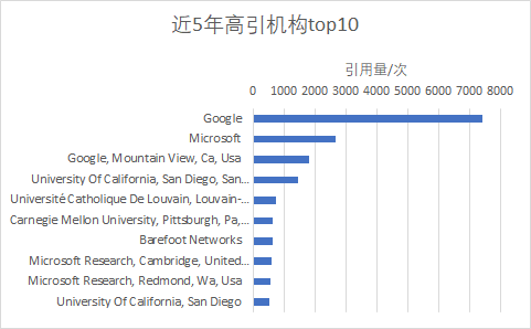 在引用量方面,投稿数靠前的机构如微软谷歌等仍然引用量靠前,而未出现在投稿数量前十榜单的加州大学圣迭戈分校,卡内基梅隆大学异军突起,进入了引用量排名前十。