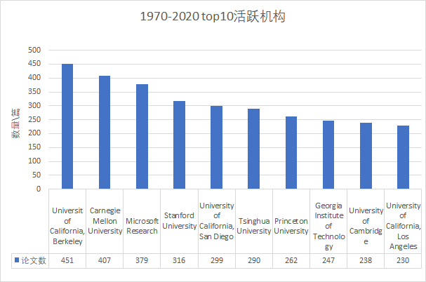 从论文被收录的数量来看,活跃的投稿机构大多来自大学机构,最活跃投稿的机构是加州大学伯克利分校,共计有 451 篇投稿,投稿排名第二第三的分别是卡耐基梅隆大学与微软研究院,微软公司也是唯一进入前十的工业界机构。国内机构只有清华大学以 290 篇论文进入投稿排行榜前十。具体前十榜单见图 1。