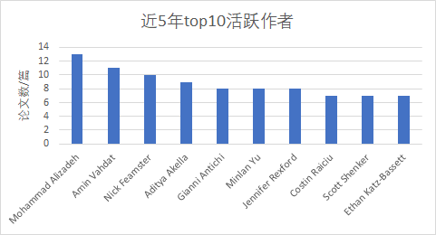 按投稿数来排名,排名前十的作者大多都有 8 篇论文左右的投稿,投稿数最多是来自麻省理工学院的 Mohammad Alizadeh,有 13 篇投稿。第二第三名分别是来自加州大学圣地亚哥分校与普林斯顿大学的 Amin Vahdat(11)及 Nick Feamster(10)。只有一名华人作者 Minlan Yu 进入了前十榜单。