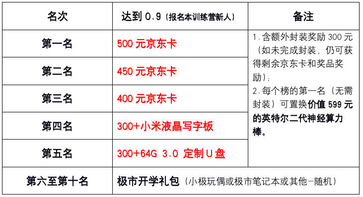 注:上述奖励的第一、二..名指在训练营期间,第一位、第二位达到0.9成绩的新人(不按分数排名)。【每个新人限领1次】