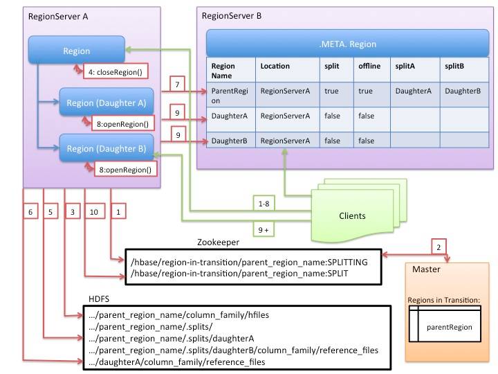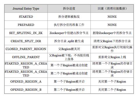 HBase将整个切分过程包装成了一个事务,意图能够保证切分事务的原子性。整个分裂事务过程分为三个阶段:prepare – execute – (rollback) ,操作模版如下: