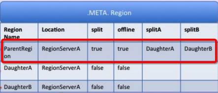 6. 父region分裂为两个子region后,将daughter A、daughter B拷贝到HBase根目录下,形成两个新的region。