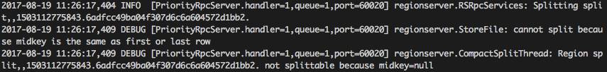 什么情况下会出现没有切分点的场景呢?最常见的就是一个文件只有一个block,执行split的时候就会发现无法切分。很多新同学在测试split的时候往往都是新建一张新表,然后往新表中插入几条数据并执行一下flush,再执行split,奇迹般地发现数据表并没有真正执行切分。原因就在这里,这个时候仔细的话你翻看debug日志是可以看到这样的日志滴: