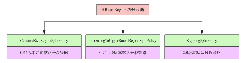 在最新稳定版(1.2.6)中,HBase已经有多达6种切分触发策略。当然,每种触发策略都有各自的适用场景,用户可以根据业务在表级别选择不同的切分触发策略。常见的切分策略如下图: