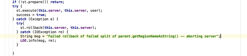 为了实现事务性,HBase设计了使用状态机(见SplitTransaction类)的方式保存切分过程中的每个子步骤状态,这样一旦出现异常,系统可以根据当前所处的状态决定是否回滚,以及如何回滚。遗憾的是,目前实现中这些中间状态都只存储在内存中,因此一旦在切分过程中出现regionserver宕机的情况,有可能会出现切分处于中间状态的情况,也就是RIT状态。这种情况下需要使用hbck工具进行具体查看并分析解决方案。在2.0版本之后,HBase实现了新的分布式事务框架Procedure V2(HBASE-12439),新框架将会使用HLog存储这种单机事务(DDL操作、Split操作、Move操作等)的中间状态,因此可以保证即使在事务执行过程中参与者发生了宕机,依然可以使用HLog作为协调者对事务进行回滚操作或者重试提交,大大减少甚至杜绝RIT现象。这也是是2.0在可用性方面最值得期待的一个亮点!
