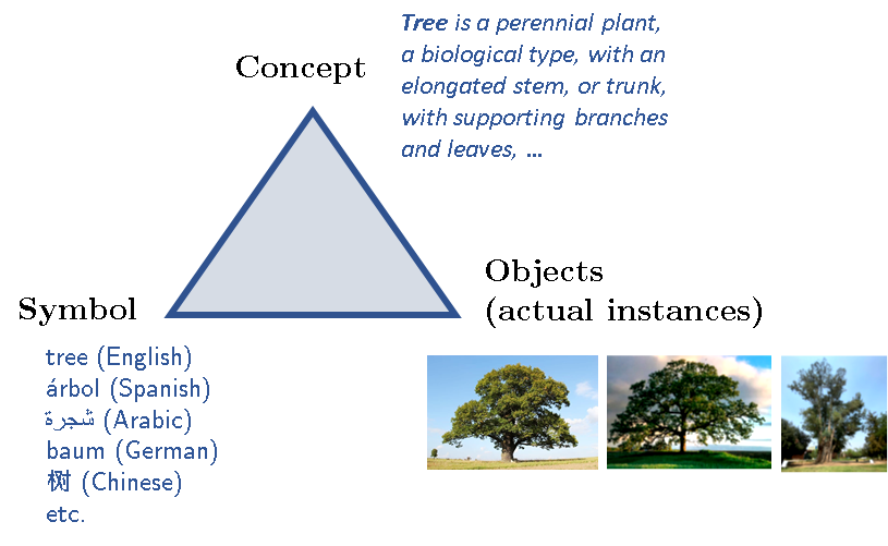 在语义三角中,每个「事物(或每个认知对象)」都具有三部分:一个指代概念符号,以及这个概念(有时)具有的一些实例。以「独角兽」这个概念为例,在现实生活中并没有实际的示例。概念本身是其所有潜在实例的理想化模板,可以想象,几个世纪以来,哲学家、逻辑学家和认知科学家一直在争论概念的本质及其定义,不管那场辩论如何,我们可以在一件事情上达成一致:一个概念(通常由某个符号 / 标签引用)由一组特性集合和属性定义,也许还有附加公理和既定事实等。然而,一个概念与实际(不完美)实例不同,在完美的数学世界中也是如此。举例而言,虽然下面的算术表达式都具有相同的扩展,但它们具有不同的「intension」: