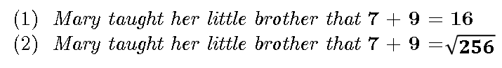 假设 (1) 是真的——也就是说,假设 (1) 确实发生了,并且我们见证了它。尽管如此,这并不意味着我们可以假设 (2) 为真,尽管我们所做的只是将 (1) 中的 16 替换为一个(假设),而该假设等于它的值。我们用一个假定等于它的对象替换了陈述中的一个对象,并且我们从真实的事物推断出不真实的事物!虽然在物理科学中可以很容易地用一个属性的对象来替换它,但这在认知中是行不通的。