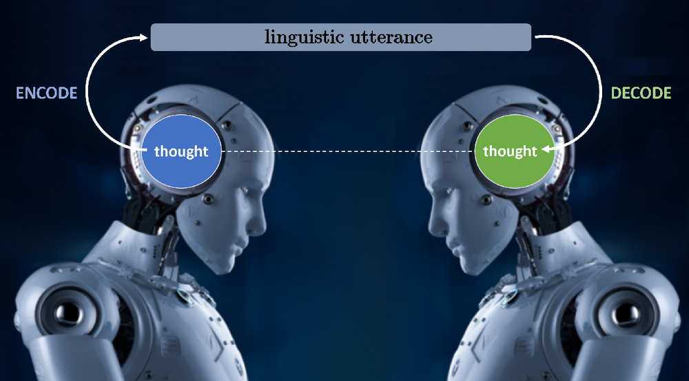 所谓的缺失文本现象(missing text phenomenon, MTP),可以将其理解为 NLP 任务挑战的核心。语言交流的过程如下图所示:说者将思想编码为某种语言表达,然后听者将该语言表达解码为说者意图传达的思想。