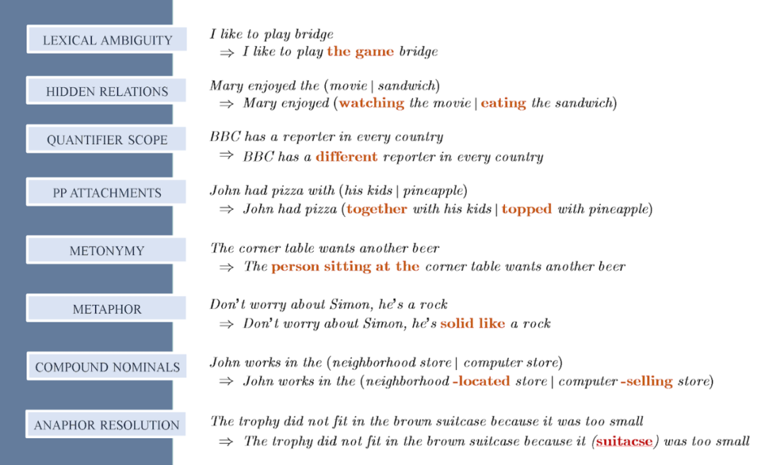 上述示例表明,NLU 的挑战在于发现缺失信息,并隐含地认为这些信息是共享背景知识。下图 3 进一步解释了缺失文本现象: