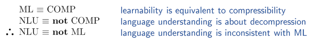 机器学习是将大量数据泛化为单个函数。另一方面,由于 MTP,自然语言理解需要智能的解压缩技术,以发现所有缺失和隐式假设文本。因此,机器学习和语言理解是不相容的——事实上,它们是矛盾的。