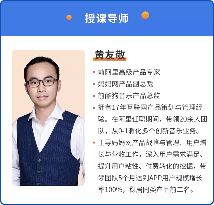 本门课程特邀前阿里巴巴高级产品专家、妈妈网产品副总裁、前酷狗音乐产品总监@黄友敬作为授课导师。