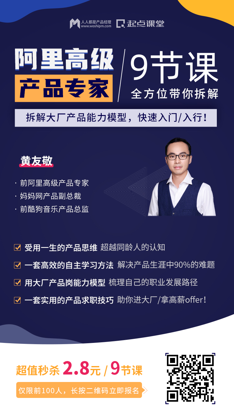 我们请到前阿里高级产品专家、酷狗音乐产品总监黄友敬,用9节干货课跟你讲清楚,大厂专业的产品经理都是如何思考与工作的!