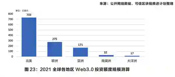 海外Web3.0创业投资额度增长迅速。据中国信通院统计,截至2022年6月,全球相关投融资总金额约达1600亿美元,投资机构主要分布在北美和欧洲,北美地区以约733亿美元投资额处于全球领先地位,欧洲地区以约275亿美元位列第二。