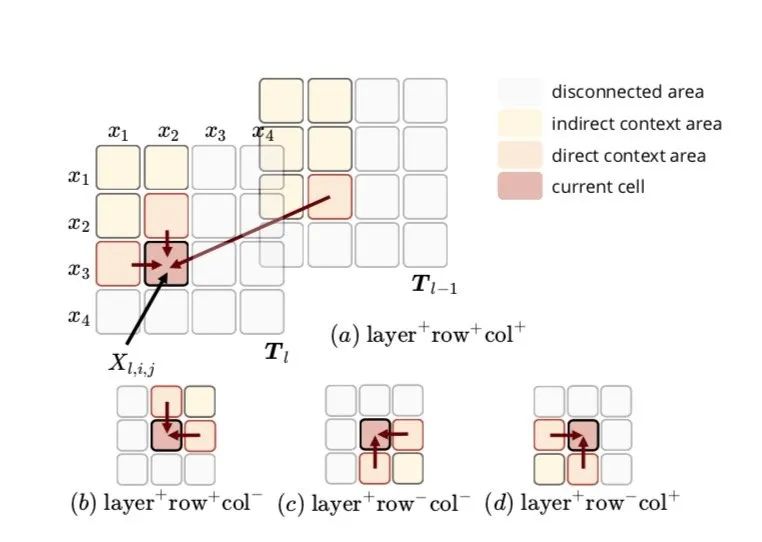 如图所示, 是来自sequence的输入,作者分别测了使用所有方向和分别使用几个方向,发现上图中a,c效果类似,这种多维GRU全面的考虑了整个table的结构信息,即一个词的状态跟其他所有词的状态相关,并且受其他词的不同程度的影响,这种影响程度由GRU门控机制控制