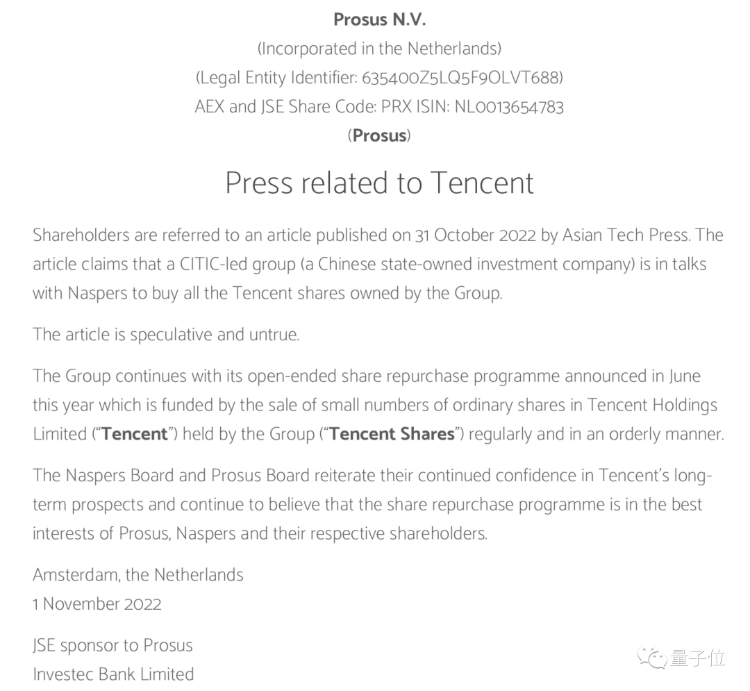在声明中,Prosus表示:对腾讯的长期前景仍有信心。