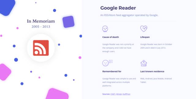 在Product Graveyard,那些知名的产品会有一个单独的页面。在页面里,每个产品会被标注它死亡的原因、它的存活时间、它为什么值得被人们纪年、它最后所支持的平台(住所)。