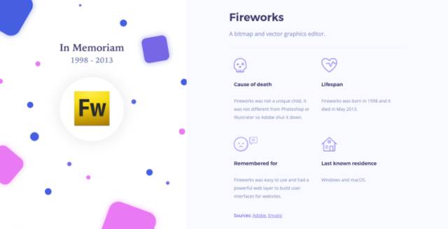 你甚至不记得Fireworks是用来做什么的,在Product Graveyard里Fireworks的“墓碑”上写着它的死因:Fireworks不是个独生子,它和Photoshop、Illustrator没什么区别,Adobe杀了它。