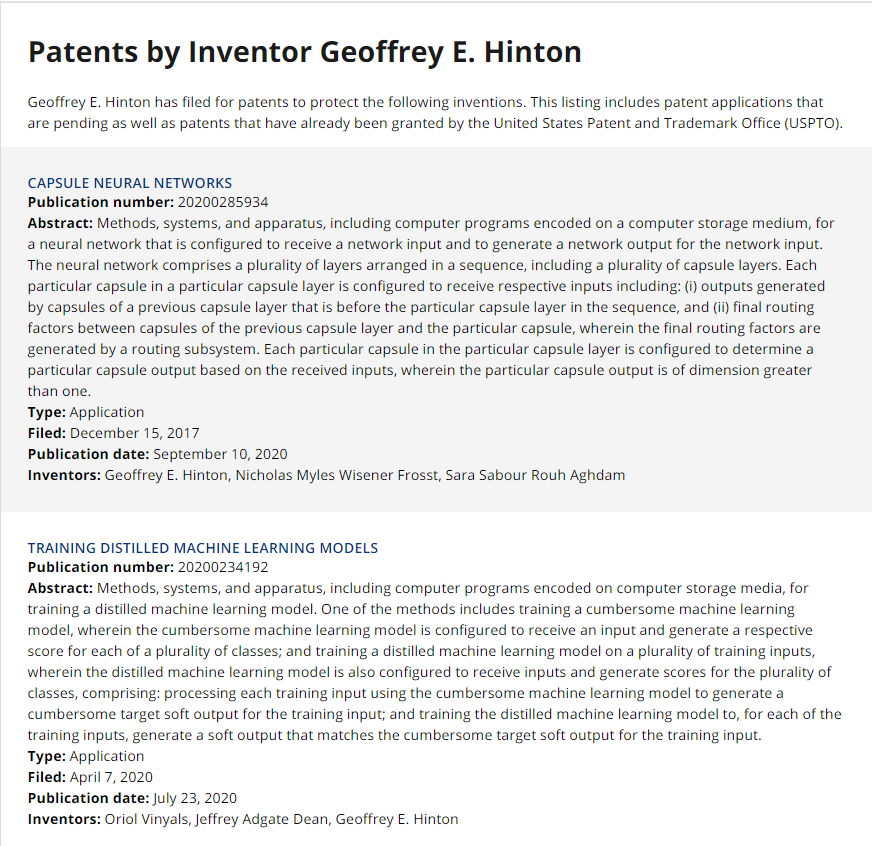 其实从网站patents.justia.com上可以看到,Hinton本人共申请了24项AI算法专利,大部分的专利受让人都是谷歌,以下是最近的两个专利,第一个便是胶囊网络: