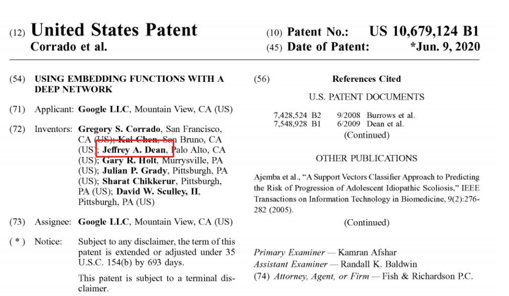 2020年6月,谷歌又申请了一项AI算法专利:《Using embedding functions with a deep network》,这一次的主要大牛是Jeffrey Dean。