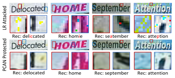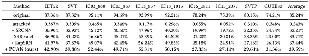 最后,我们讨论了一种文本超分辨率新的用途。将其作为抵抗对抗噪声的一种有效手段,为OCR管道同时带来性能和安全性方面的提升。如图6所示,我们可以看到经过PCAN处理的带噪低分辨率样本,对对抗噪声能够起到改变数据流型、去除噪声的效果,同时还能很明显的看出来文本部分的细节被更多的重建出来了。如表4所示,我们横向比较了若干超分方法,我们的方法能够一定程度上提升OCR识别管道的安全性,可作为研究OCR管道安全性的一个值得探讨的研究方向。