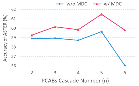 图 4 PCAB模块的连接方法、数量方面的性能差异。MDC表示模块间稠密连接