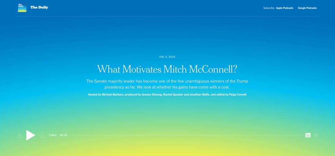 我曾经收听过几周由《纽约时报》制作的高人气新闻类播客《The Daily》,但并没有坚持多久。取关的原因说来奇怪,正是这档节目成功的秘诀——它的新闻叙事太吸引人了,以至于让我感到不安。与传统新闻节目不同,《The Daily》从不向听众填鸭一套由记者整理好的事实和观点,而是将事件发展中的片段和素材、包括幕后的撰稿经历原样呈上。配合上精巧的剪裁、配乐和主播 Mike Babarro 抓耳的叙述,《The Daily》相当于引导着听众以记者的视角经历了一遍事件,从而产生强烈的代入感。