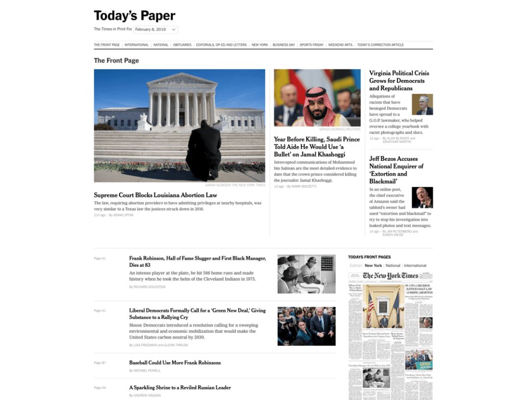 于是,我回归到了一种非常老派的做法——看报纸。当然,我不会真的去订一份报纸看,而是采用了一种数字化的等价方式:我在浏览器书签里保存了《纽约时报》的 「今日报纸」(Today’s Paper) 页面,每天早上定时打开浏览。这个页面相当于纸板报纸的在线目录,同样也会按版面分类,我可以按自己的兴趣只看其中的头版、国际和商业等几个板块。
