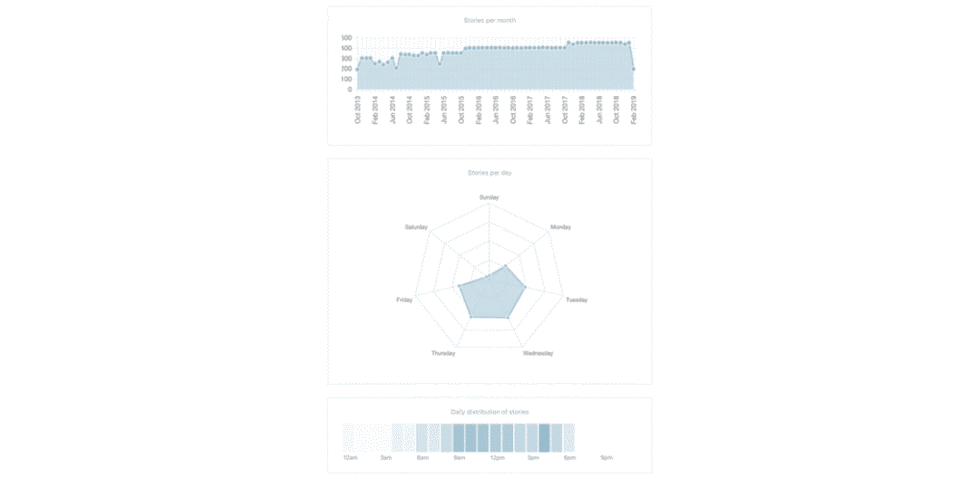 例如,我微博和 Twitter 上关注的账号都在 100 个左右,这些账号什么时候会发微博 / 推文,是我无法预测的。但如果先设定一个目标——例如每次阅读不超过 100 条微博 / 推文——然后反推,就能发现积累这个数量的未读消息一般需要六个小时左右。类似地,我觉得每次处理三四十条 RSS 是负担较小的,而 NewsBlur 的统计数据告诉我积累这个数目的时间一般也在六个小时。