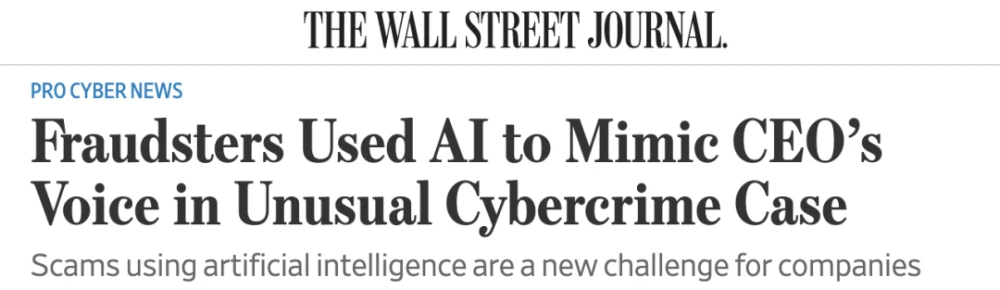 2019年,犯罪分子克隆了一家总部位于英国的能源公司CEO的声音,骗走了24万美元,原因就是这个假CEO在口音和语气上听起来都是十分真实的。这起事件是欧洲已知的第一起直接使用人工智能的网络犯罪。