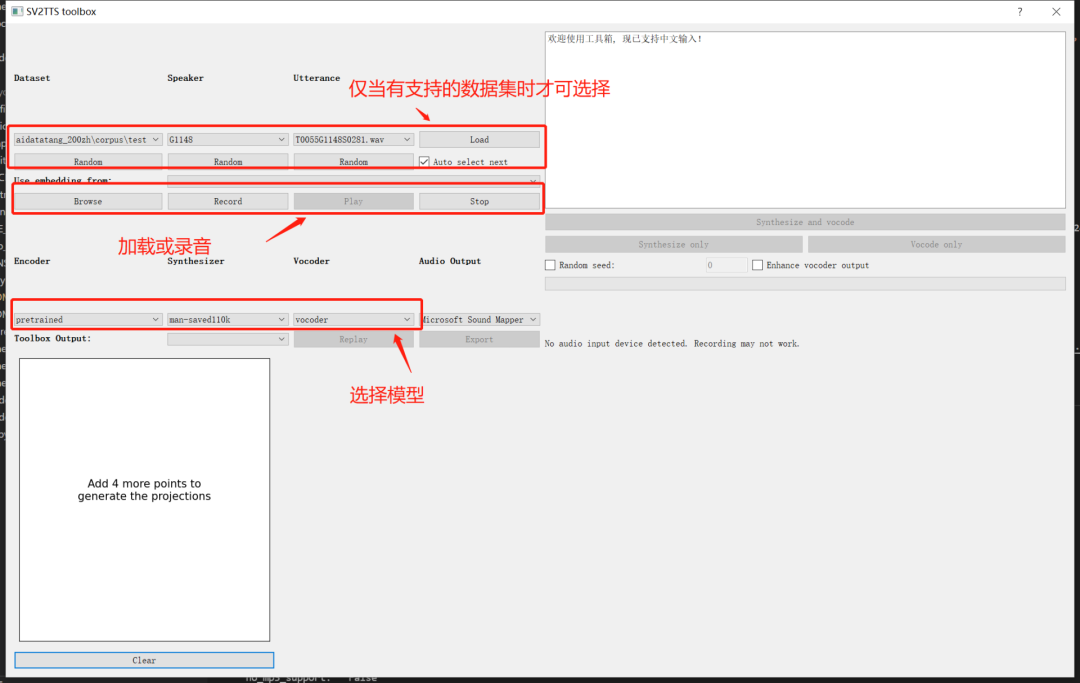 重要的数据处理操作是进行音频和梅尔频谱图预处理:python pre.py <datasets_root> 可以传入参数 --dataset {dataset} 支持 aidatatang_200zh, magicdata, aishell3