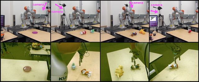 人们非常擅长在不将视点调整到某一固定或特殊位置的情况下操纵物体。这种能力(我们称之为「视觉动作整合」)在孩童时期通过在多种情形中操纵物体而习得,并由一种利用丰富的感官信号和视觉作为反馈的自适应纠错机制控制。然而,在机器人学中,基于视觉的控制器很难获得这种能力,目前来看,这种控制器都基于一种用来从固定安装的摄像头读取视觉输入数据的固定装置。在视点大幅变化的情况下快速获取视觉运动控制技能的能力将对自动机器人系统产生重大影响——例如,这种能力对于参与救援工作或在灾区作业的机器人来说尤其必要。