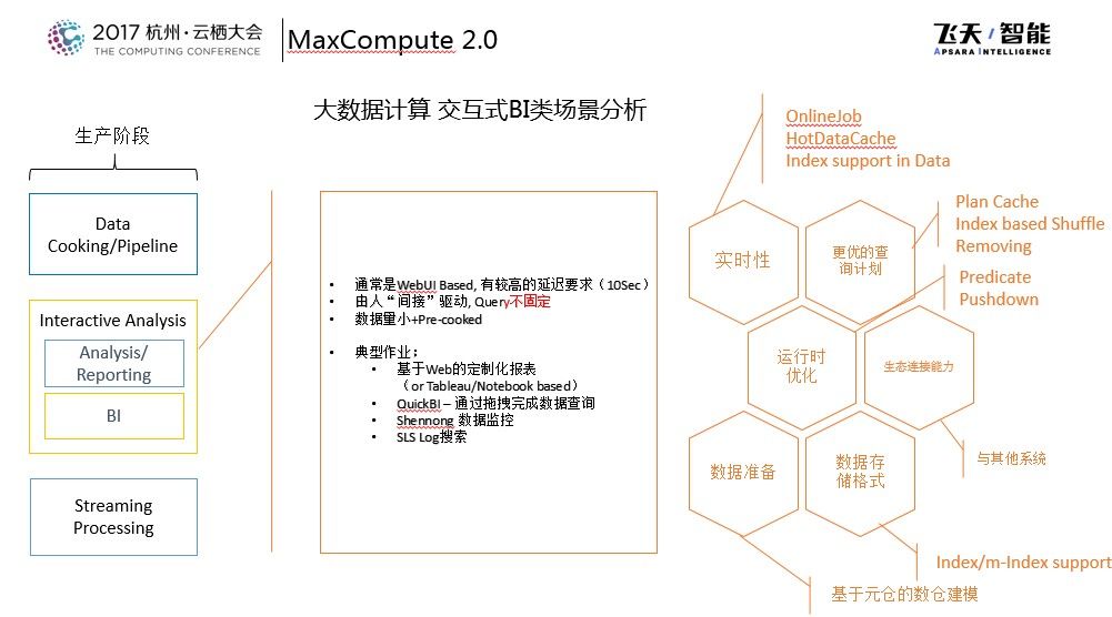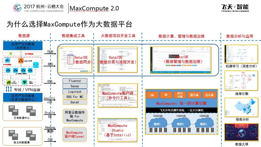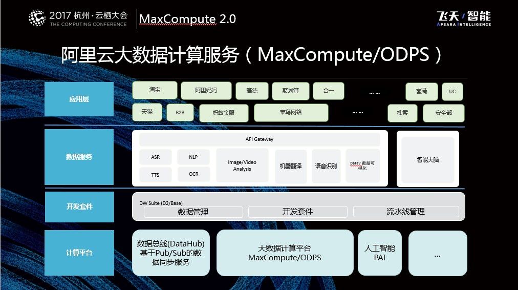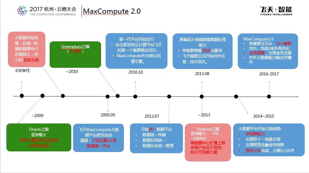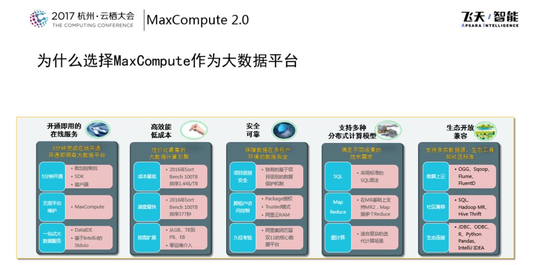 在2016年杭州云栖大会上,阿里巴巴发布了MaxCompute 2.0,那个时候推出了全新的SQL引擎并且提供非结构化处理能力,在2017年MaxCompute做了持续的创新和优化。