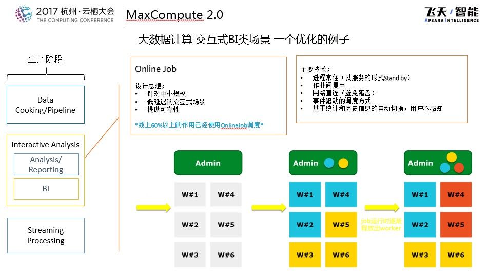 交互分析的数据量处于中小级别,有一定的延迟要求。所以这样不同任务对应的不同的技术优化方案,Data Workflow就偏向pipeline型的作业,提升运行性能和效率是关键,对于以开发类和BI类的作业为主的,作业量比较大占大头,但是整体资源占用率比较低,对于这种类型开发效率和时序化是关键。今年在MaxCompute大数据平台的发展上,除了继续提升整体系统效率以外,时序化和开发效率也是今年的重点。