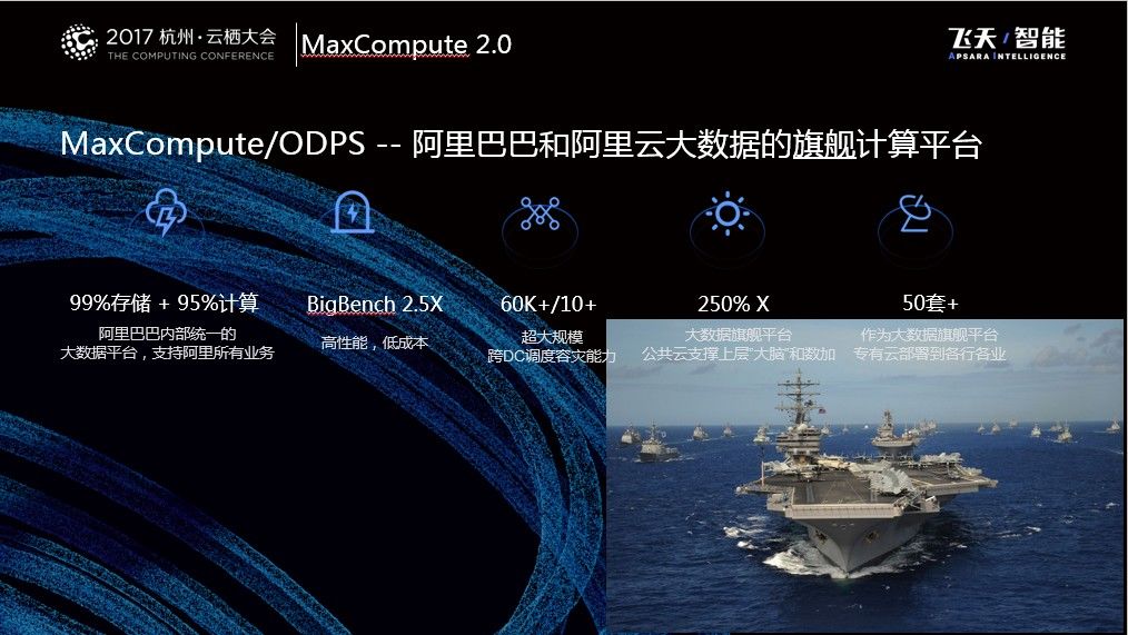 首先做一个基本的定位,大家可以看到下面这张图是一个航空母舰战队。如果把阿里巴巴整体数据体系比作这个战队,那么MaxCompute就是中间的那艘航空母舰,几乎阿里巴巴99%的数据存储以及95%的计算能力都在这个平台上产生。