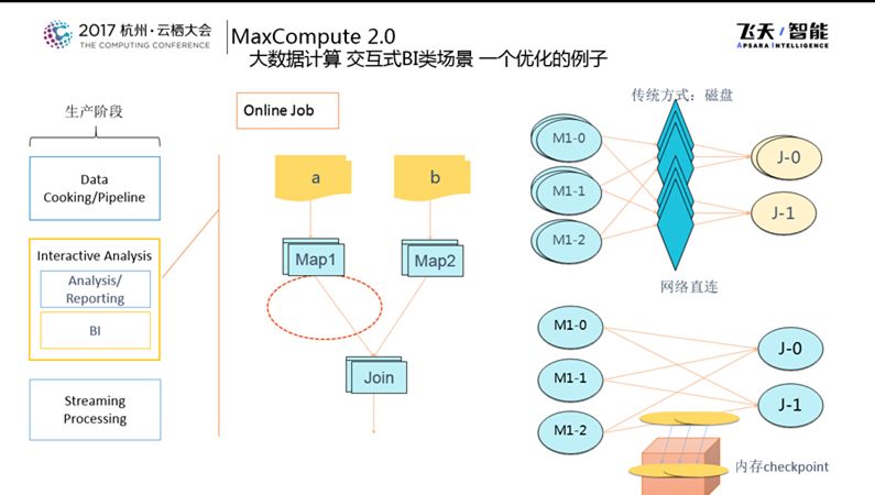 下图所展示的是交互式BI类场景下一个优化的例子。传统基于MapReduce的方式拉起多个Mapper做Shuffle的时候数据会落到磁盘里,然后再由下面的Join去读取,中间是割裂的,需要进行一次磁盘的数据交换,而MaxCompute的方式是做网络直连,这样的好处是不用等到第一个Session做完,第二个Session就可以启动,而这样同时也会带来一个坏处就是当failover的时候Group就会变得很大。