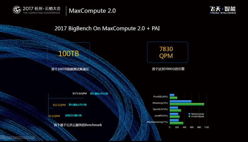 目前MaxCompute是全球第一个将这些Query从10TB做到100TB级别的引擎,这样的能力也是基于阿里内部庞大的数据量的锤炼获得的,其次MaxCompute是首个达到7000分的引擎,第三点是MaxCompute性价比的优势,我们是首个基于公共云的服务可以跑通整个Query的服务,总体而言费用也是非常便宜的。