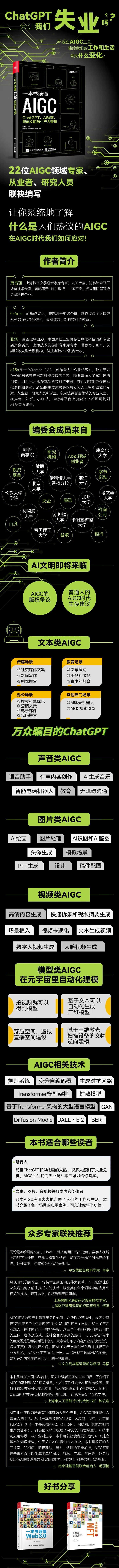 AIGC带来的生产力变革与每个人都息息相关,本书适合所有人阅读,特别是文本、图片、音视频等各类内容创作者,以及科技行业、金融行业的从业者和对AI领域感兴趣的读者。