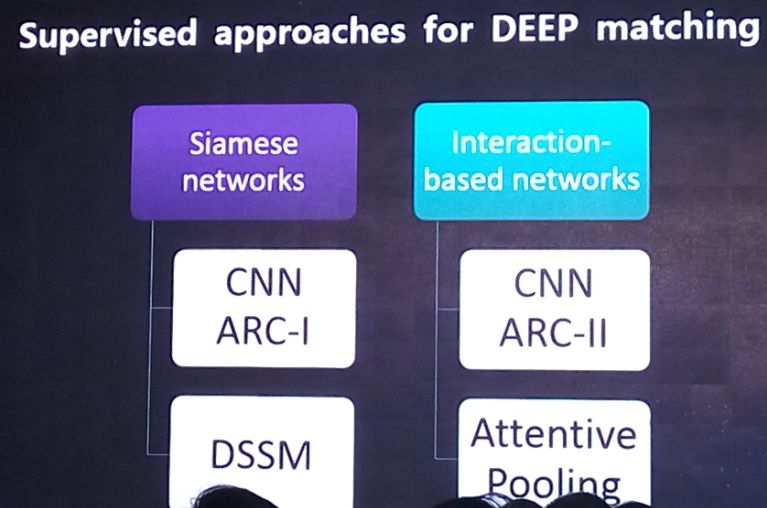 智能问答引擎的第二种方法是深度匹配的监督学习方法或者称其为监督的深度匹配方法。采用了两条思路,一条是基于Siamese networks神经网络架构,这是一种相似性度量方法,内部采用深度语义匹配模型(DSMM,Deep Structured Semantic Model),该方法在检索场景下使用点击数据来训练语义层次的匹配。另一条思路是Interaction-based networks,同时对问题和答案进行特征加权的Attention方案。