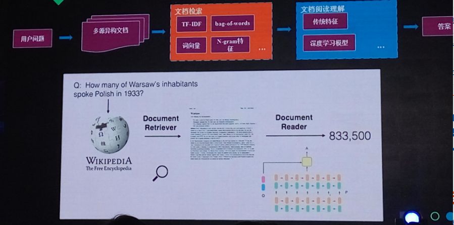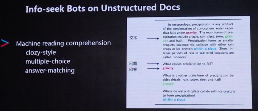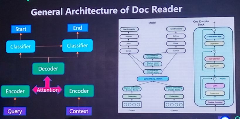 以下两张PPT给出了如何结合query从文档中获取答案的流程,及采用end-end的方式解码文档理解文档。这个在会议上未理解清楚,后续还需要查找腾讯知文开放的相关论文或文档来理解。